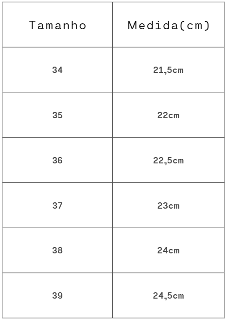 Tamanho: Forma Pequena. Aconselhamos a compra de uma numeração maior que a sua de uso habitual.