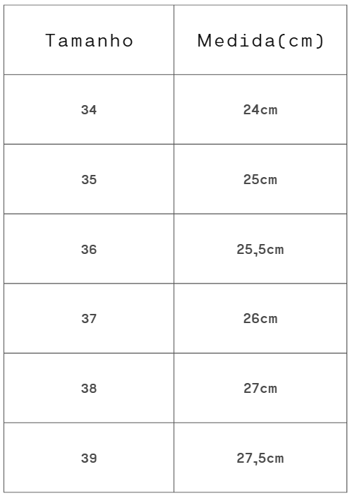 Tabela de Medidas: Sugerimos descontar 1,5cm da medida abaixo devido ao formato do bico.