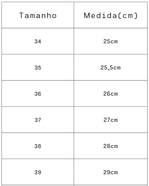 Tabela de Medidas: Sugerimos descontar 1cm da medida abaixo devido ao formato do bico.