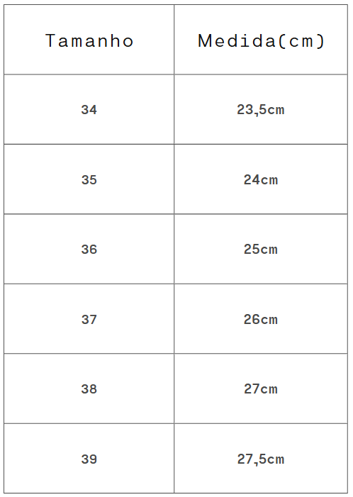 Tabela de Medidas: Sugerimos descontar 2,5cm da medida abaixo devido ao formato do bico.