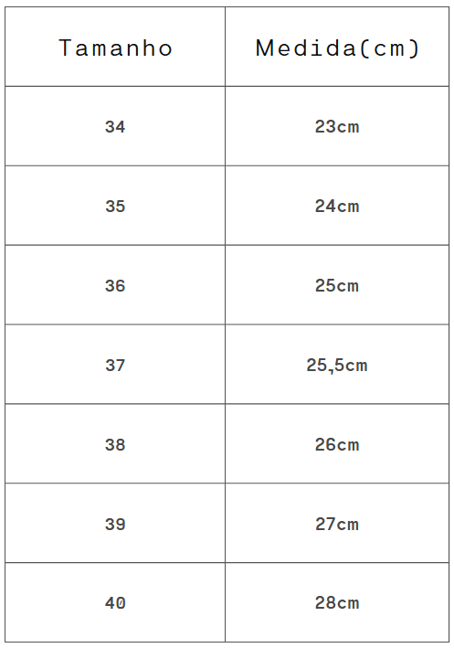 Tabela de Medidas: Sugerimos descontar 1,5cm da medida abaixo devido ao formato do bico.