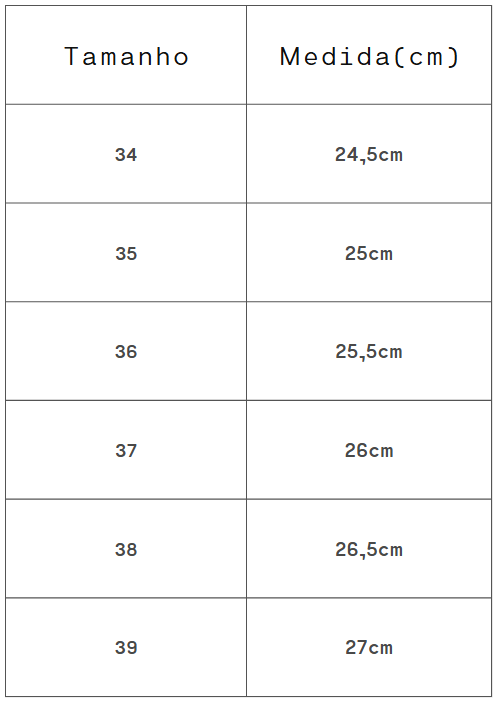Tabela de Medidas: Sugerimos descontar 2,5cm da medida abaixo devido ao formato do bico.