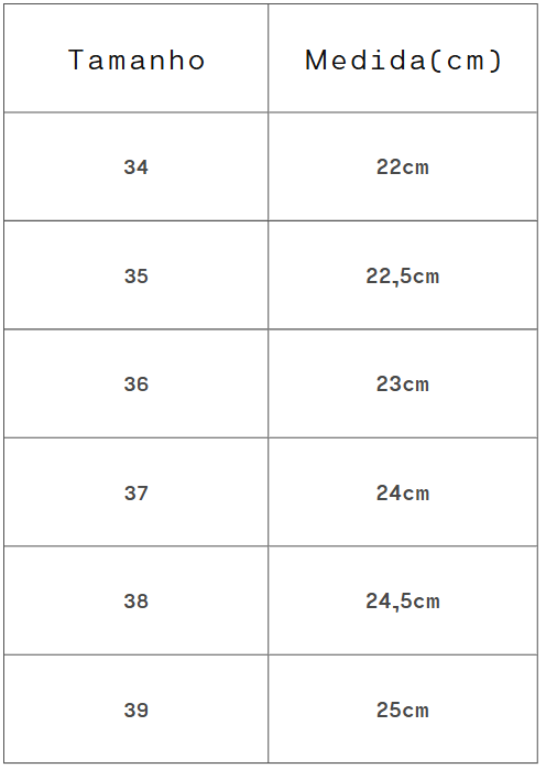 Tamanho: Forma Normal. Aconselhamos a compra de sua numeração de uso habitual.