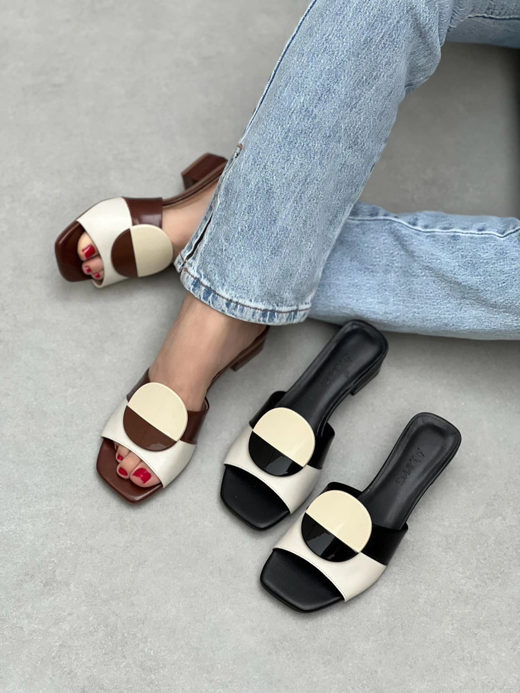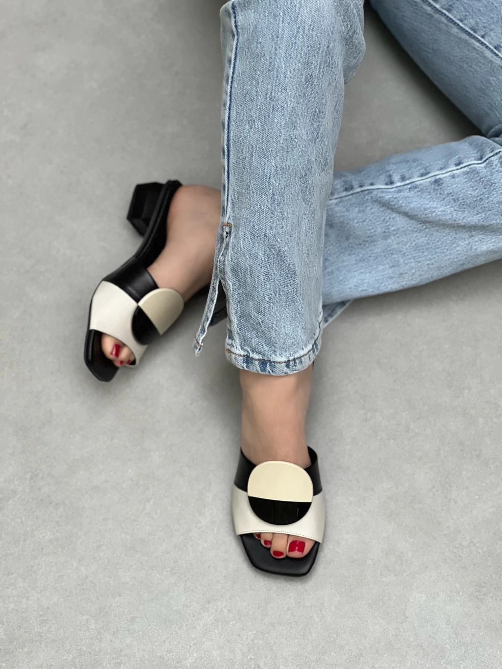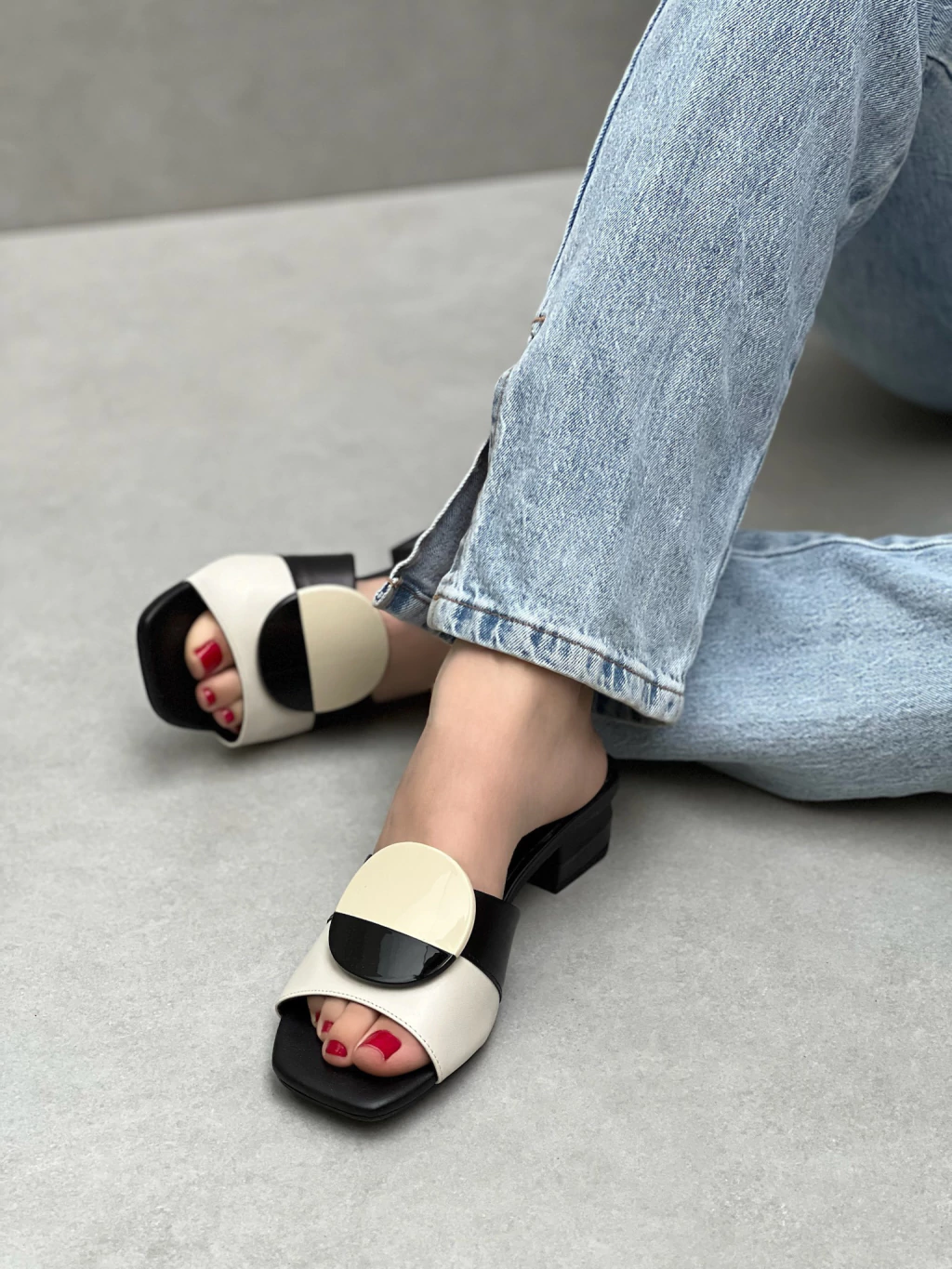 Esse modelo é a pedida certa pra quem gosta de marcar presença com elegância. O destaque fica por conta do detalhe geométrico em contraste, que traz um visual moderno e cheio de personalidade. O salto baixo garante conforto sem perder a sofisticação, tornando a peça versátil para diferentes ocasiões.